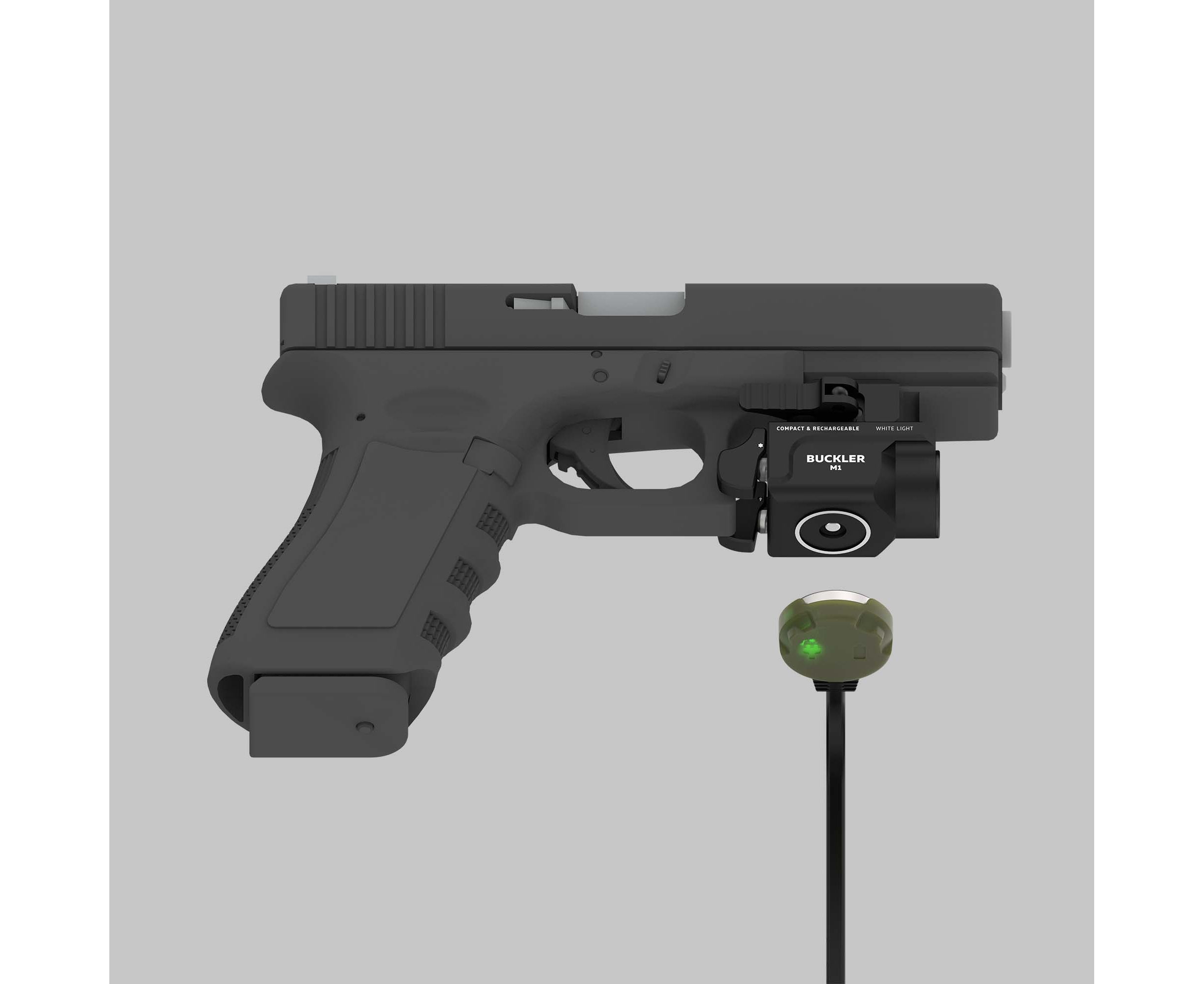 Buckler M1 is a tactical flashlight with white light for mounting on a handgun. The compact model is suitable both for special tasks and for civilian application. Buckler M1 is equipped with a built-in battery and is charged via the included magnetic charger without removing the flashlight from the weapon. Integrated mount with a sliding frame allows adjusting the position of the flashlight for use on any handgun.