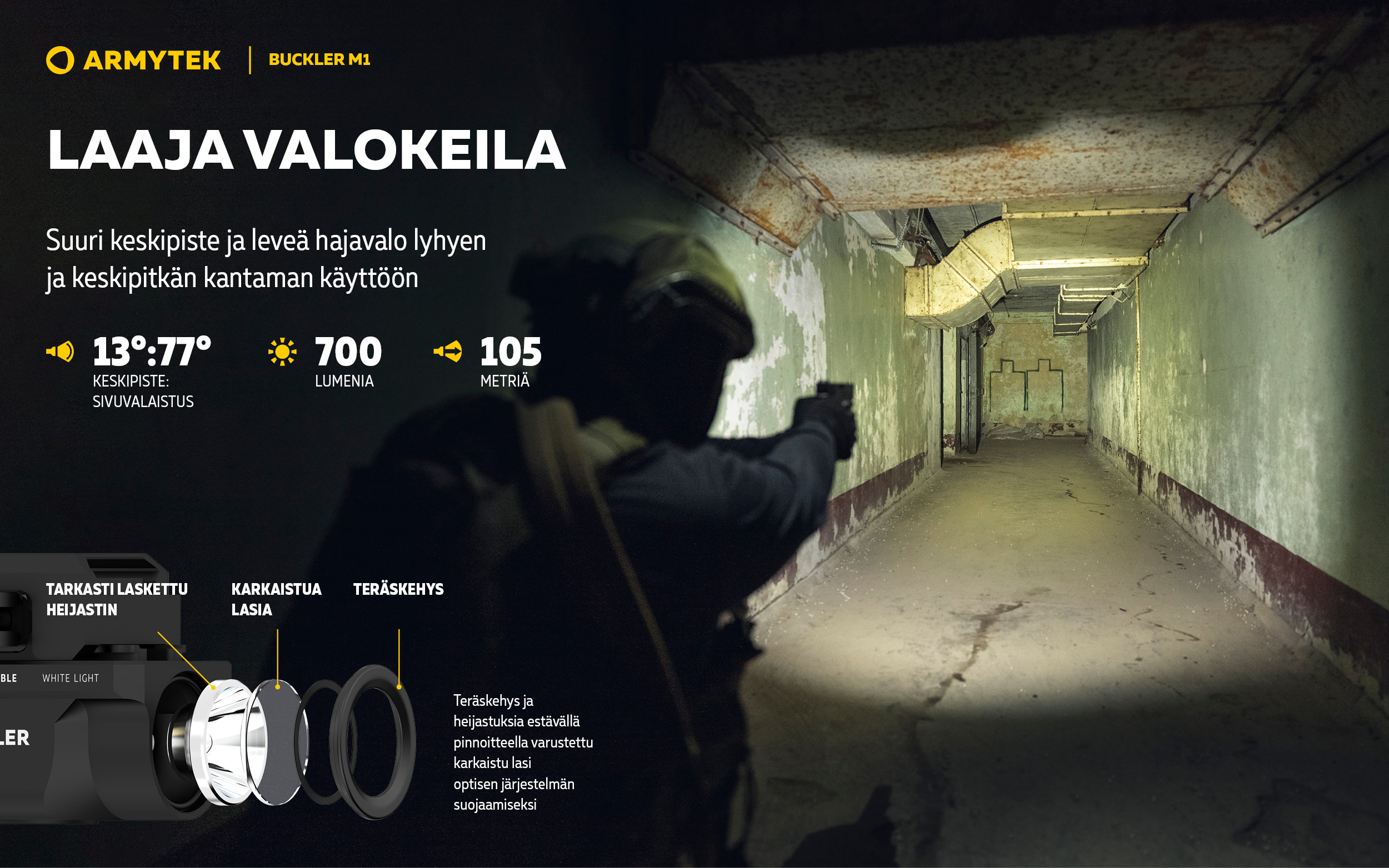 - Erityinen tarkasti laskettu heijastin ja karkaistu, heijastamaton pinnoitettu lasi luovat laajan valokeilan keskipisteen ja leveän hajavalon, mikä helpottaa tähtäystä ja tilanteen arviointia lähietäisyydellä ja keskikantamalla.