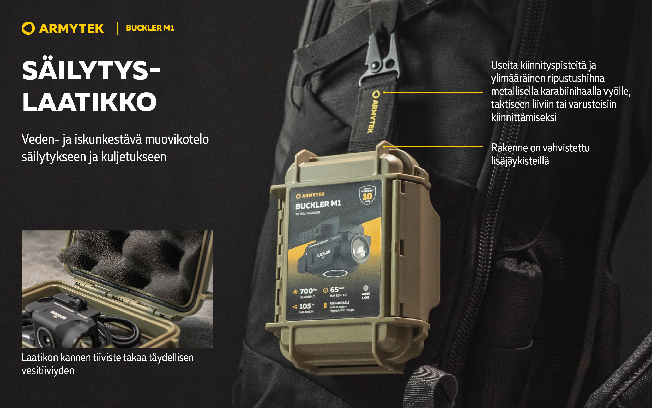 - Useita kiinnityspisteitä ja ylimääräinen ripustuspiste karabiinihaalle vyölle, taktiseen liiviin tai varusteisiin kiinnittämiseksi.