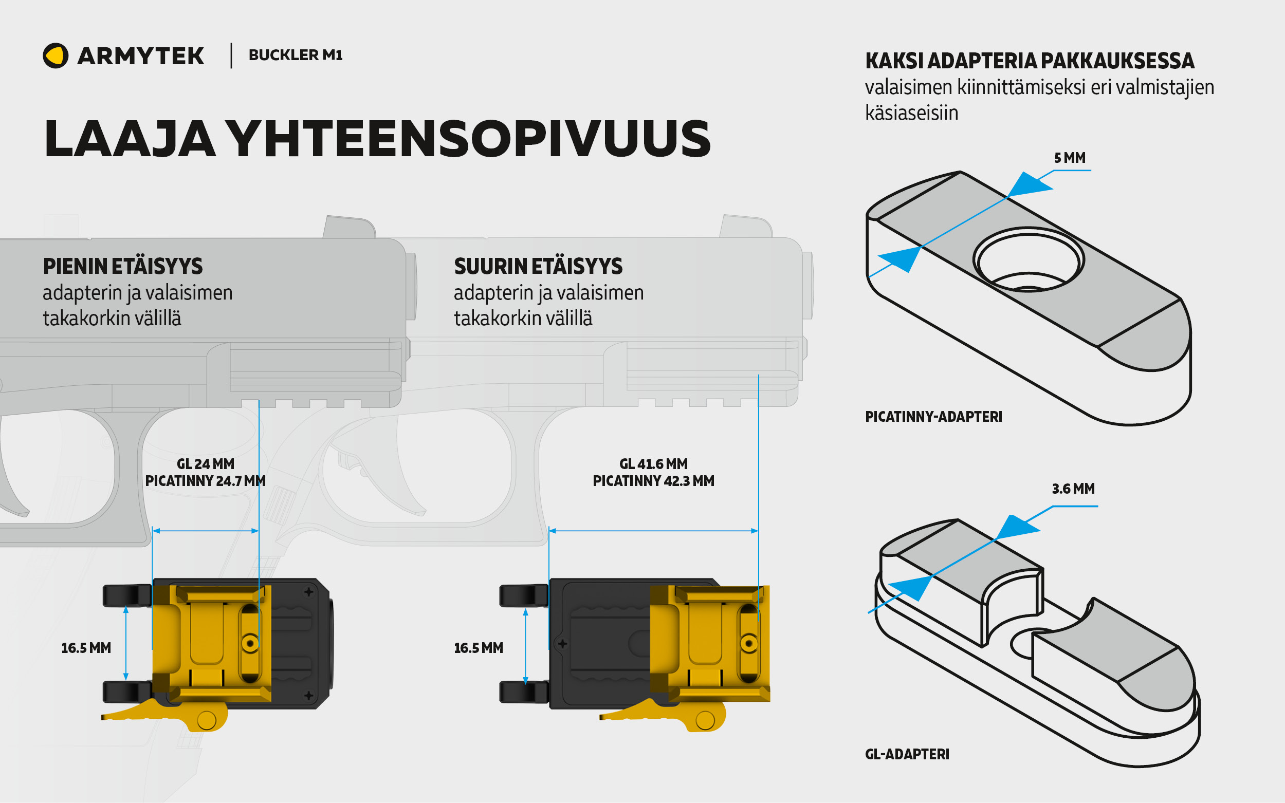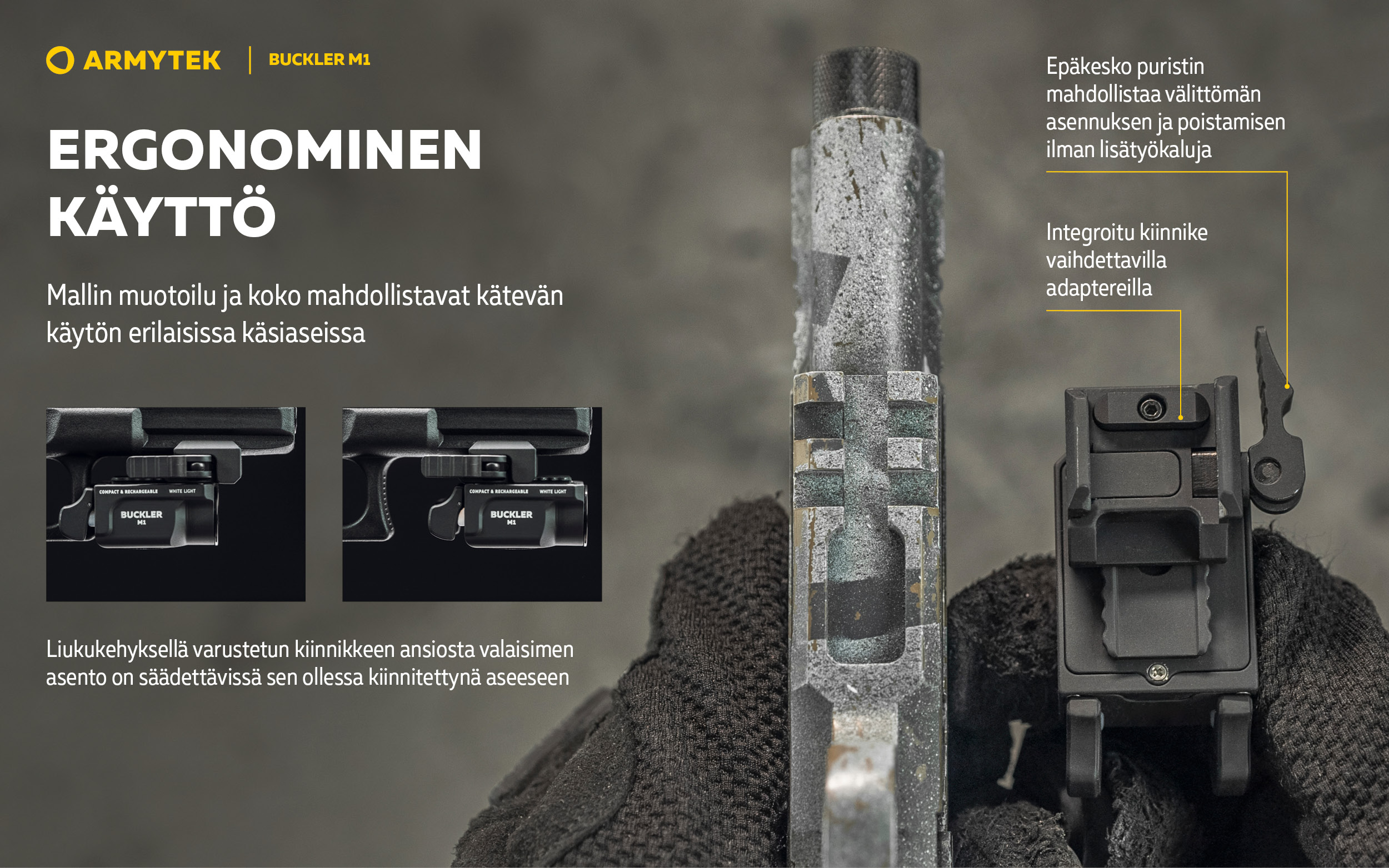 - Integroitu kiinnike liukuvalla kehyksellä mahdollistaa valaisimen sijainnin säätämisen millä tahansa käsiaseella. Nopea asennus ja irrotus ilman lisätyökaluja.