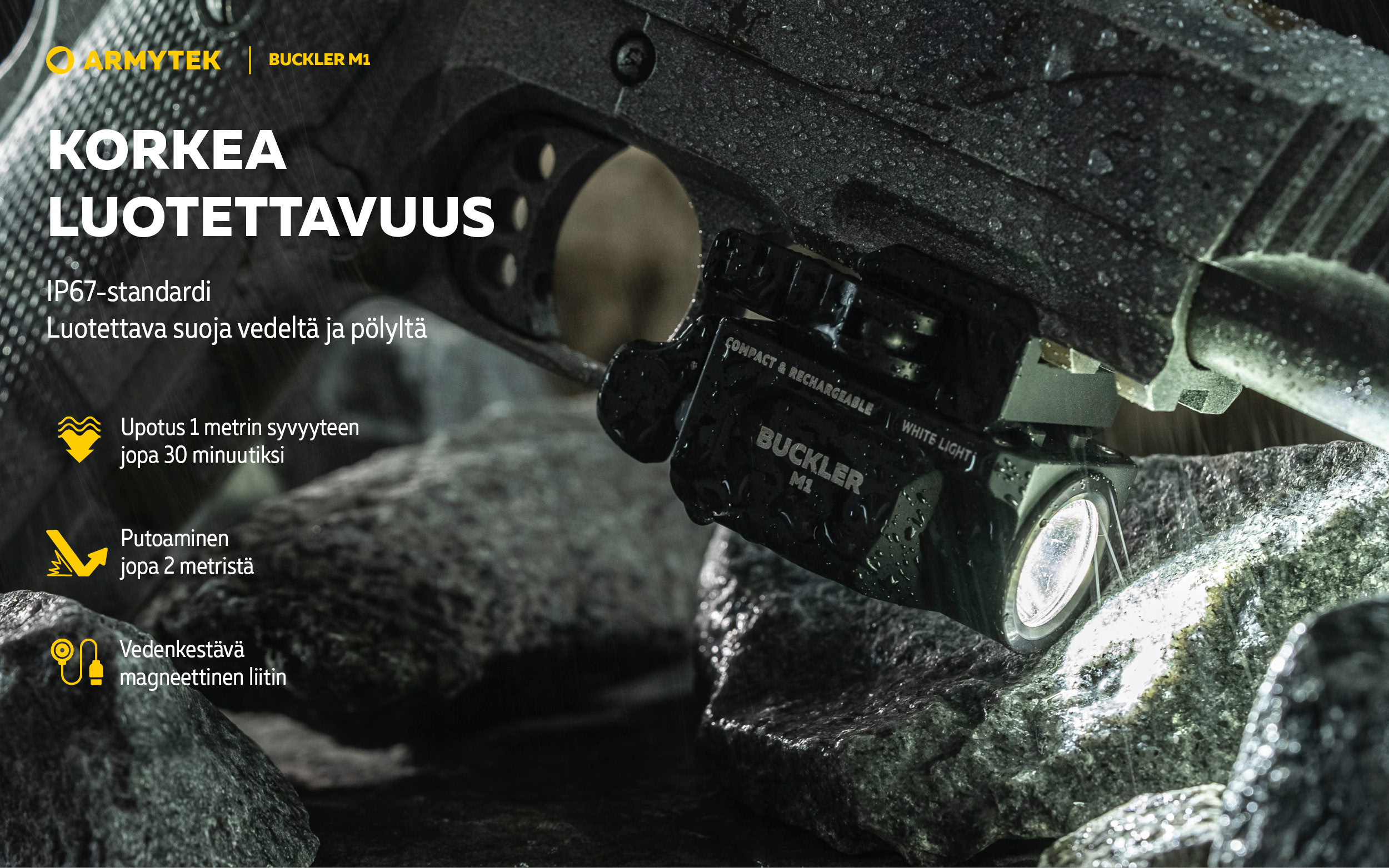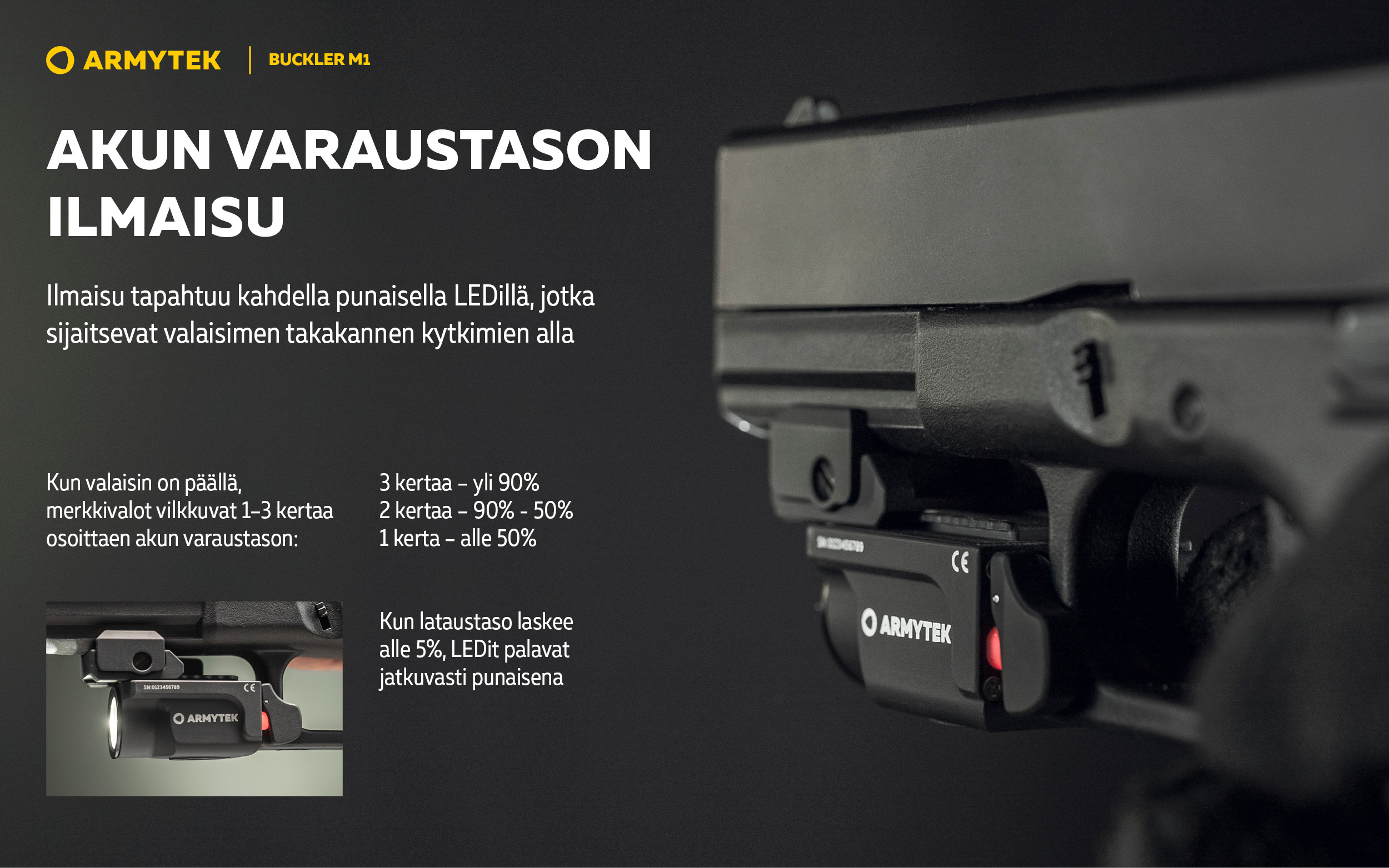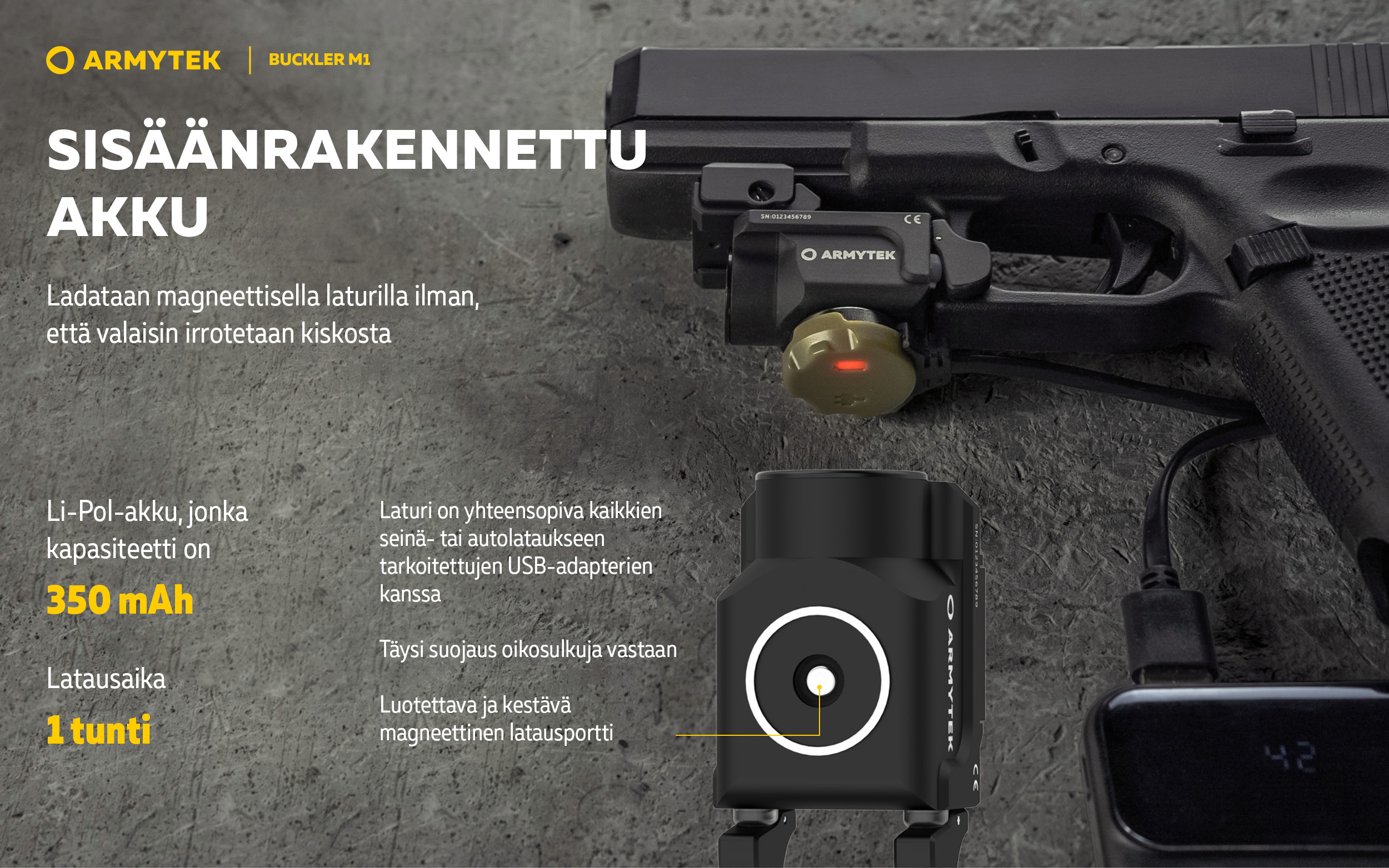 Buckler M1 on varustettu suurikapasiteettisella 350 mAh sisäänrakennetulla Li-Pol -akulla. Akun lataaminen tapahtuu kätevästi mukana toimitettavan magneettilaturin avulla ilman, että valaisinta tarvitsee irrottaa aseesta. Mallin muotoilu ja koko mahdollistavat kätevän käytön erilaisilla käsiaseilla. Integroidun kiinnikkeen epäkesko puristin mahdollistaa asennuksen ilman lisätyökaluja.
