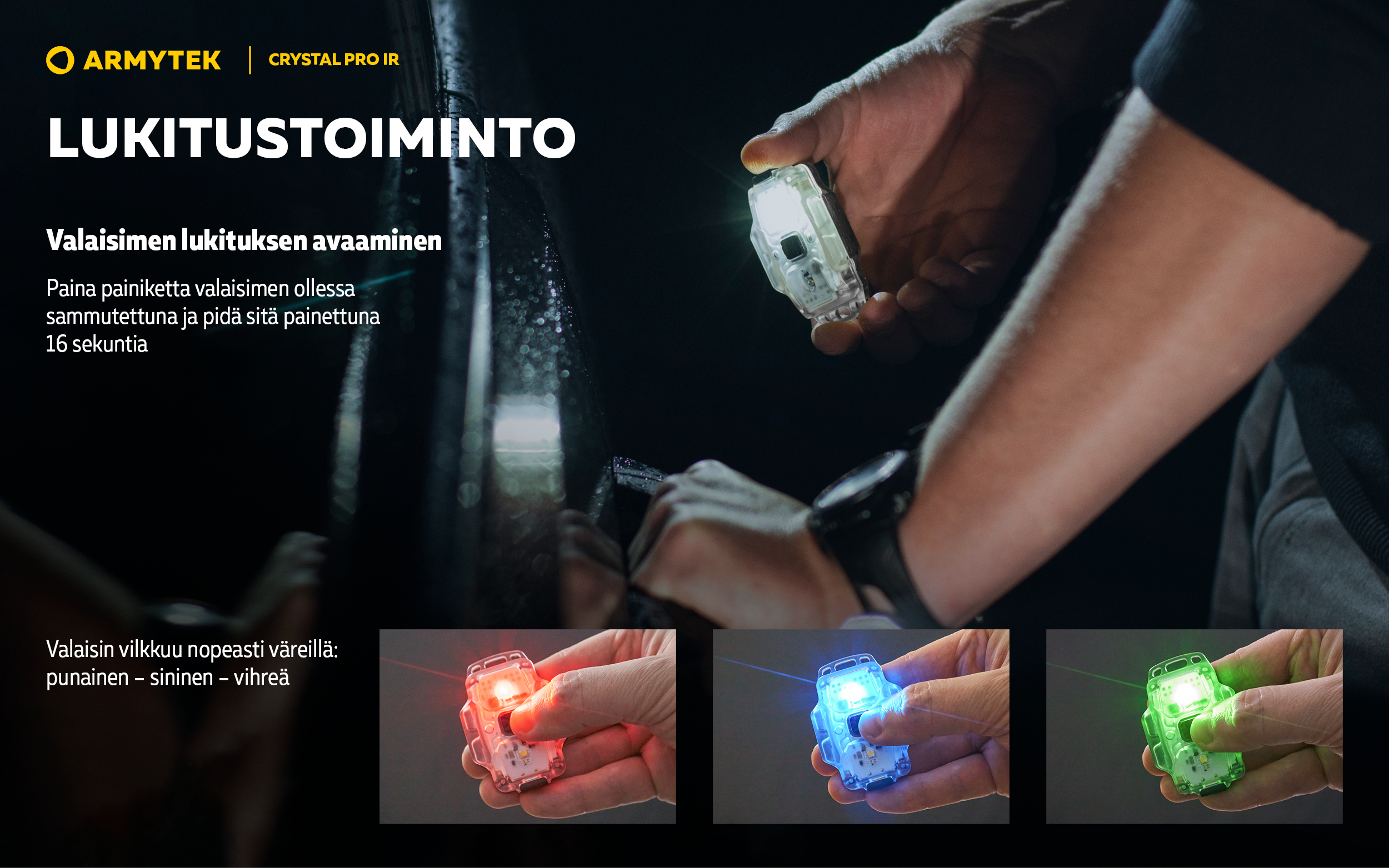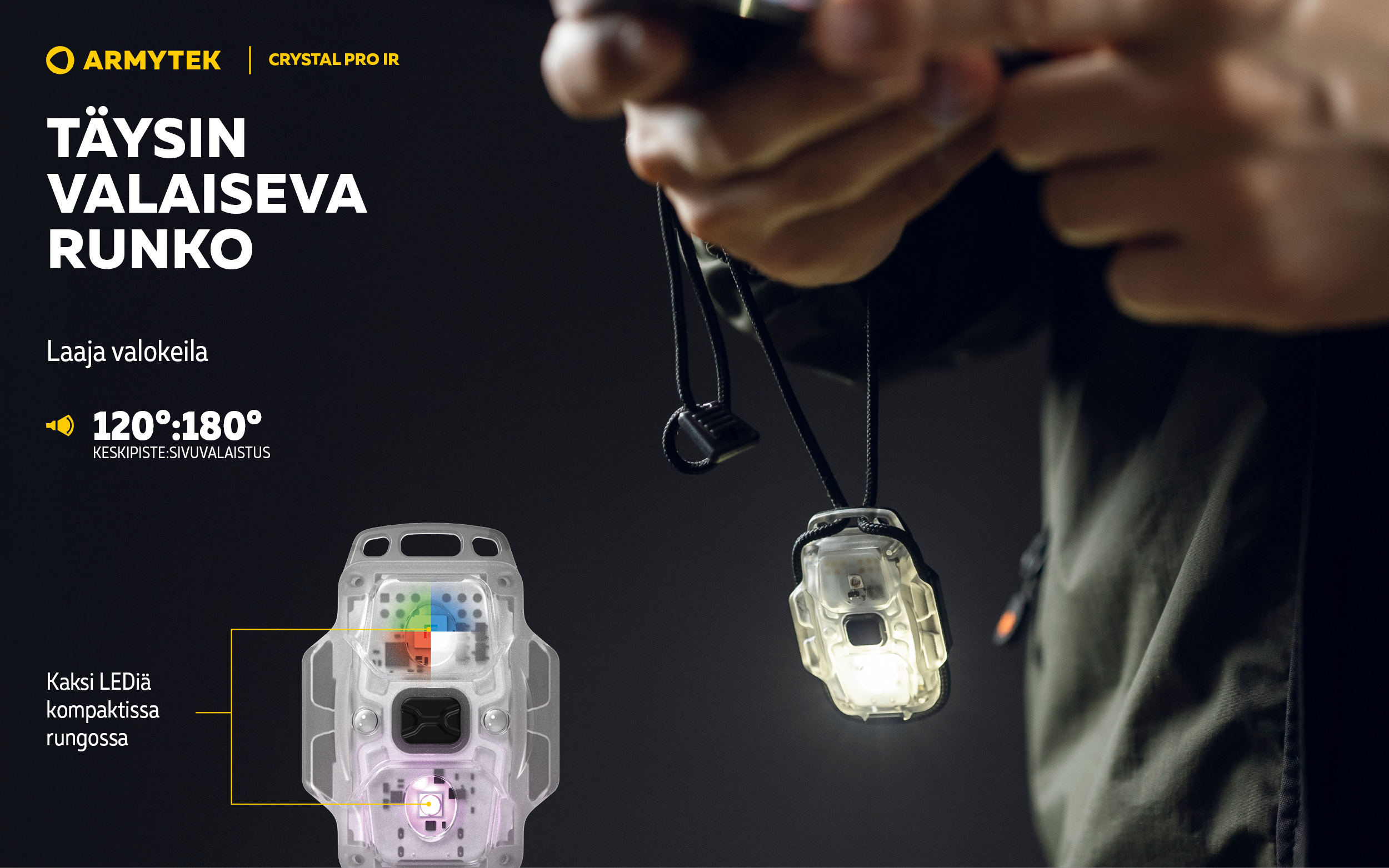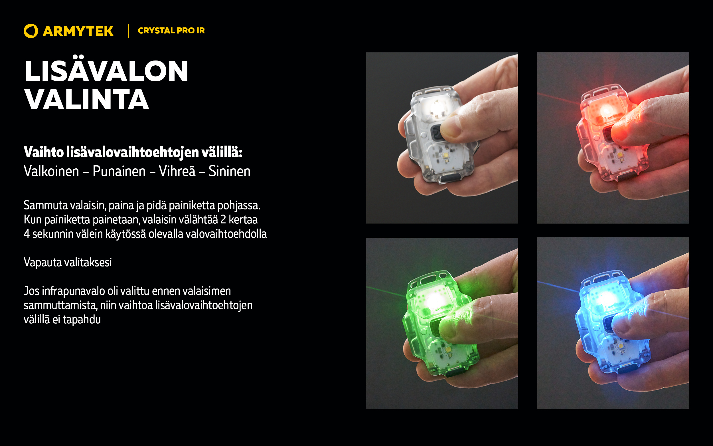 Malli päivitetystä kompaktien monitoimivalaisinten valikoimasta. Crystal Pro IR on monitoimivalaisin, jossa on yleisvalovärit (valkoinen, punainen, vihreä, sininen) sekä lisäksi LED infrapunavalolle. Tämä yhdistelmä mahdollistaa valaisimen käytön paitsi arkikäytössä myös erikoistilanteissa.