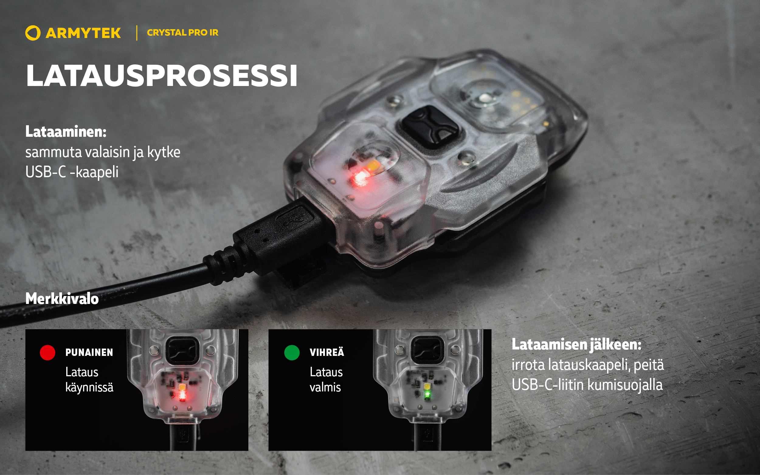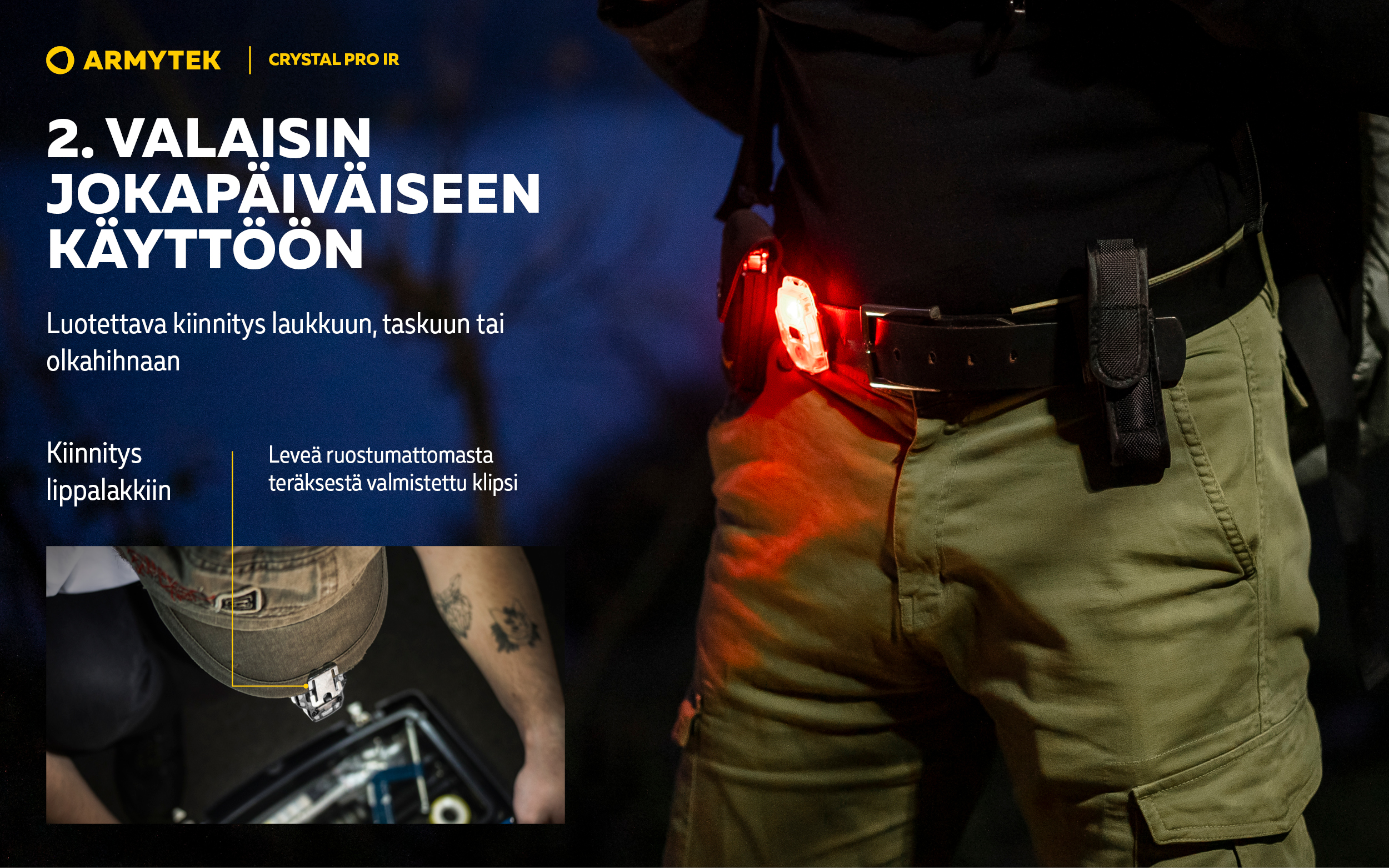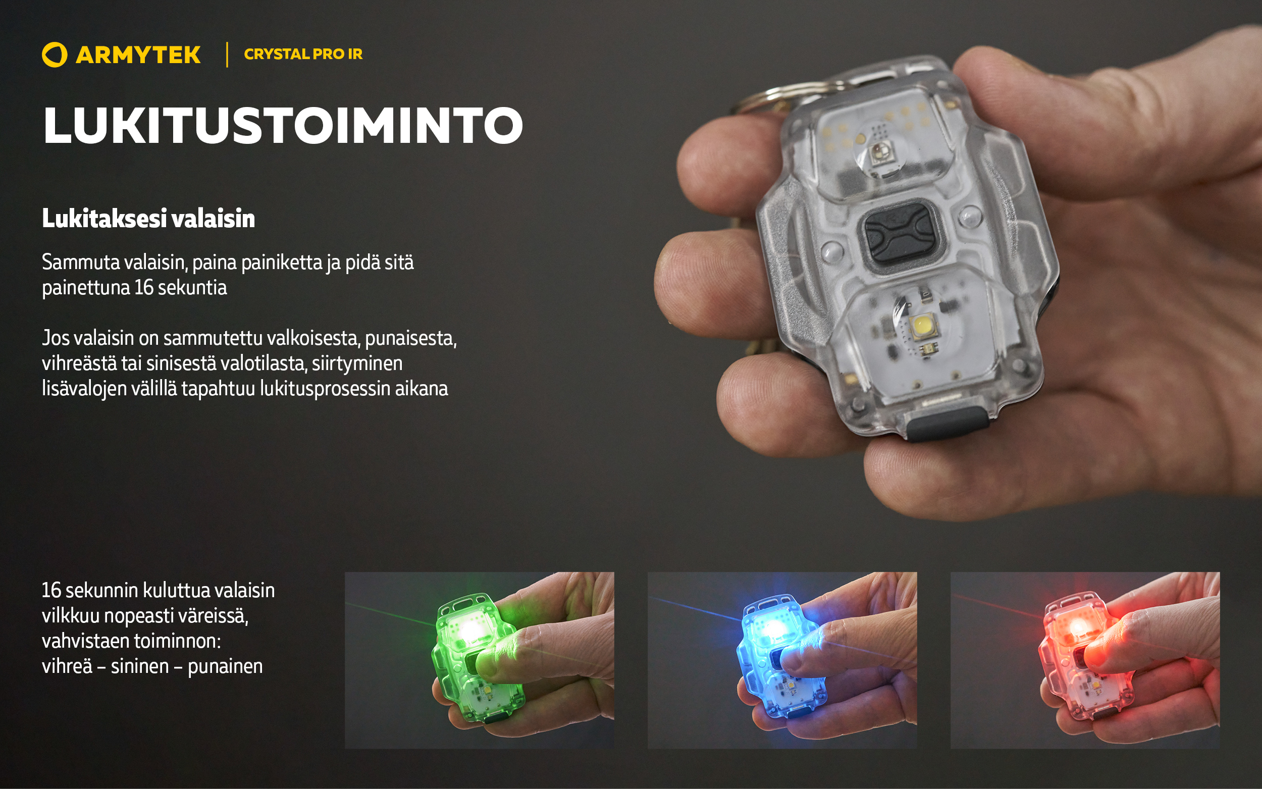 Malli päivitetystä kompaktien monitoimivalaisinten valikoimasta. Crystal Pro IR on monitoimivalaisin, jossa on yleisvalovärit (valkoinen, punainen, vihreä, sininen) sekä lisäksi LED infrapunavalolle. Tämä yhdistelmä mahdollistaa valaisimen käytön paitsi arkikäytössä myös erikoistilanteissa.