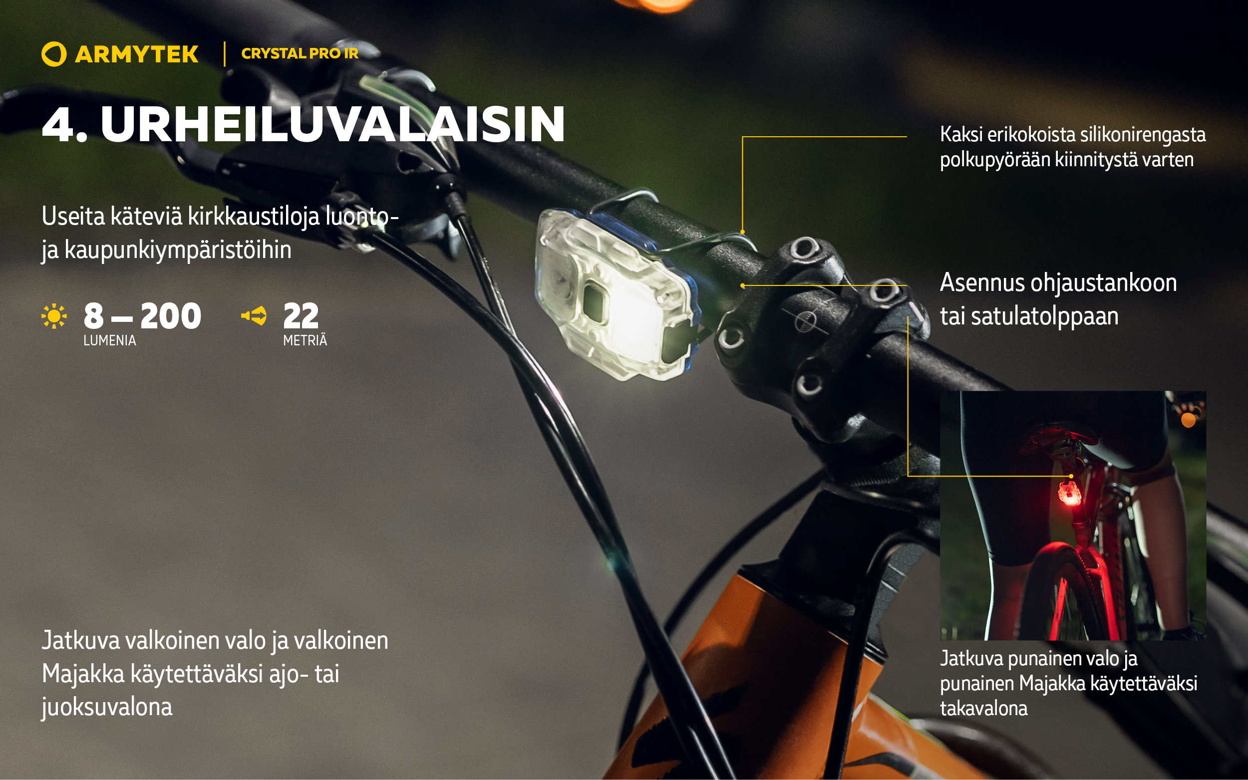 - Useita kiinnitysvaihtoehtoja, silikonirenkaat urheiluvarusteisiin kiinnitystä varten
