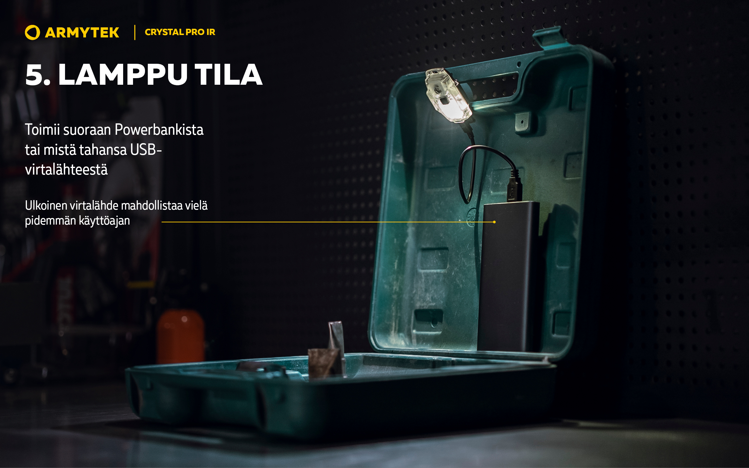 - Toimii suoraan Powerbankista tai mistä tahansa USB-virtalähteestä