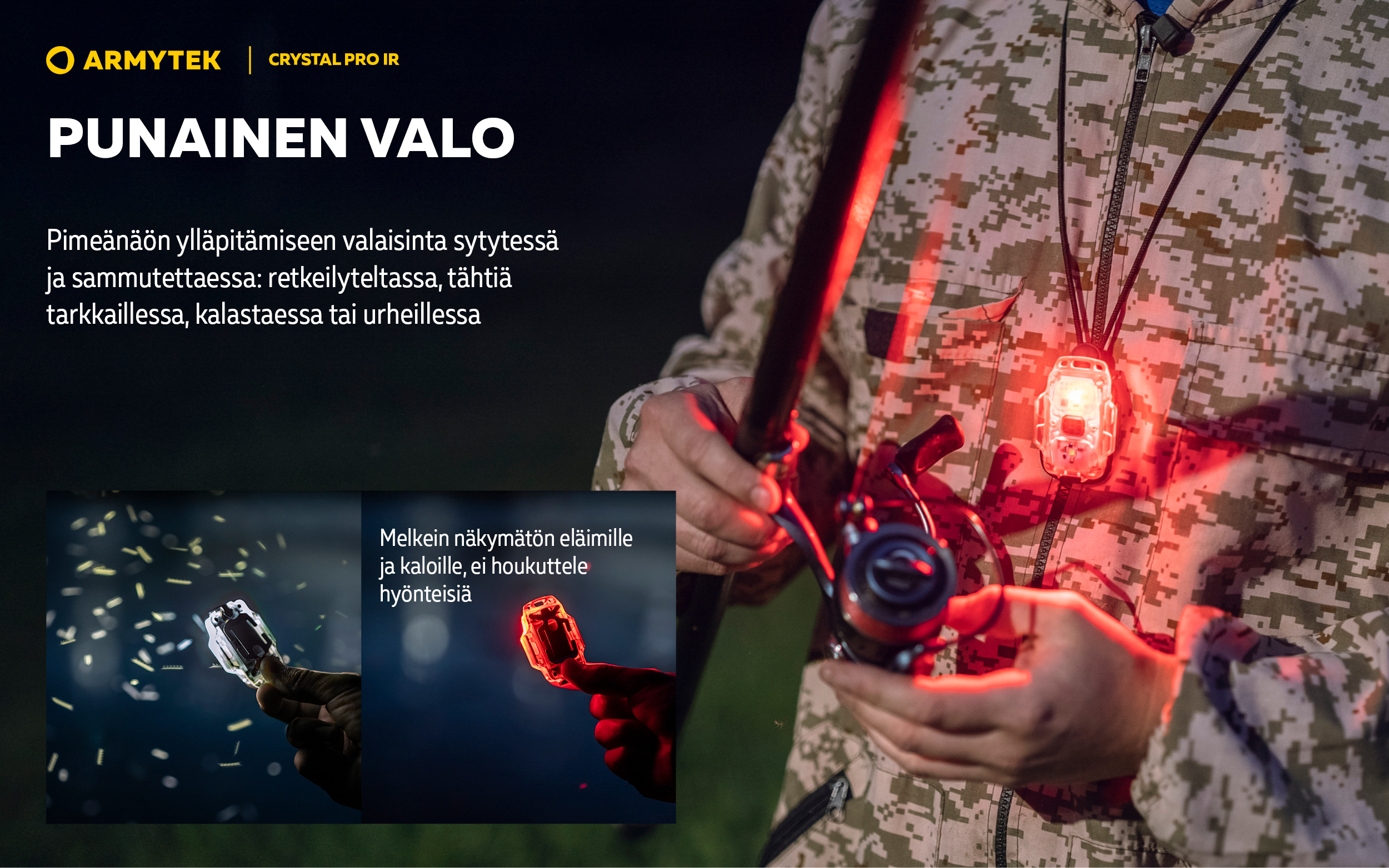 - Pimeänäön ylläpitämiseen valaisinta sytytessä ja sammutettaessa: retkeilyteltassa, tähtiä tarkkaillessa, kalastaessa tai urheillessa.