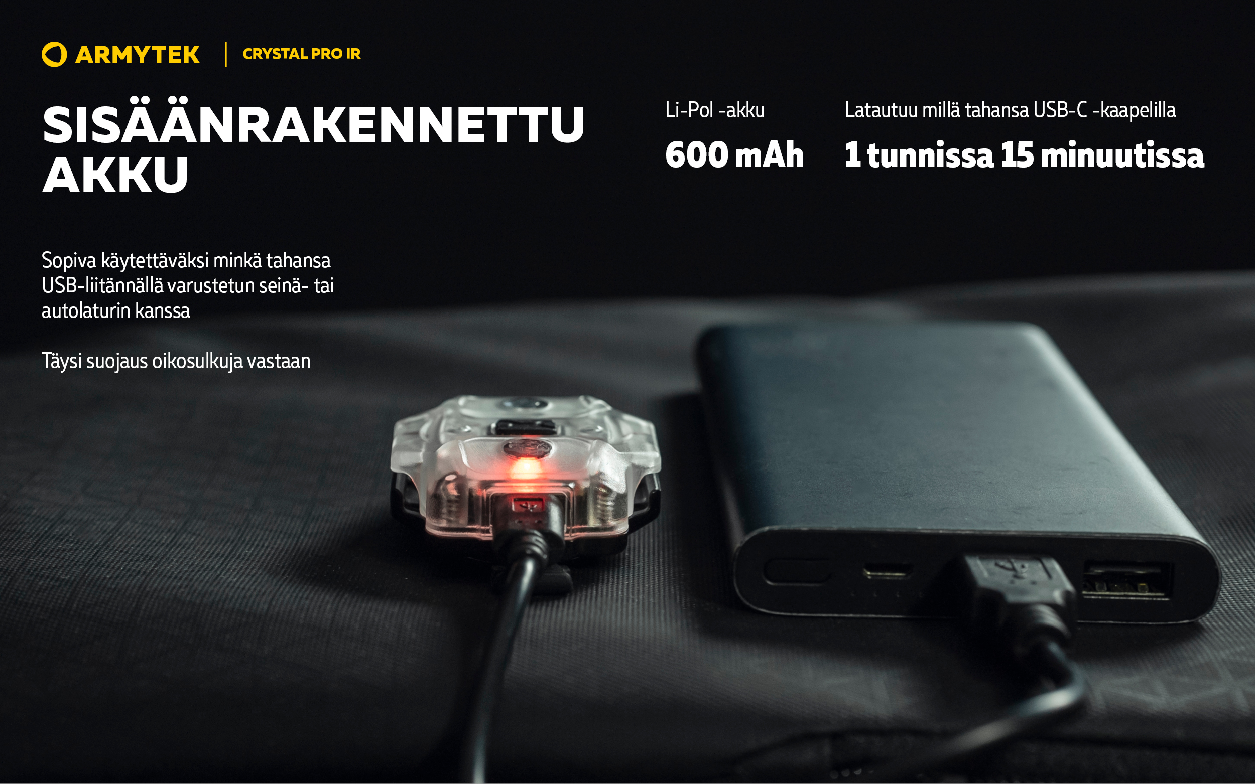 - Sisäänrakennettu 600 mAh Li-Pol -akku latautuu millä tahansa USB-C -kaapelilla.