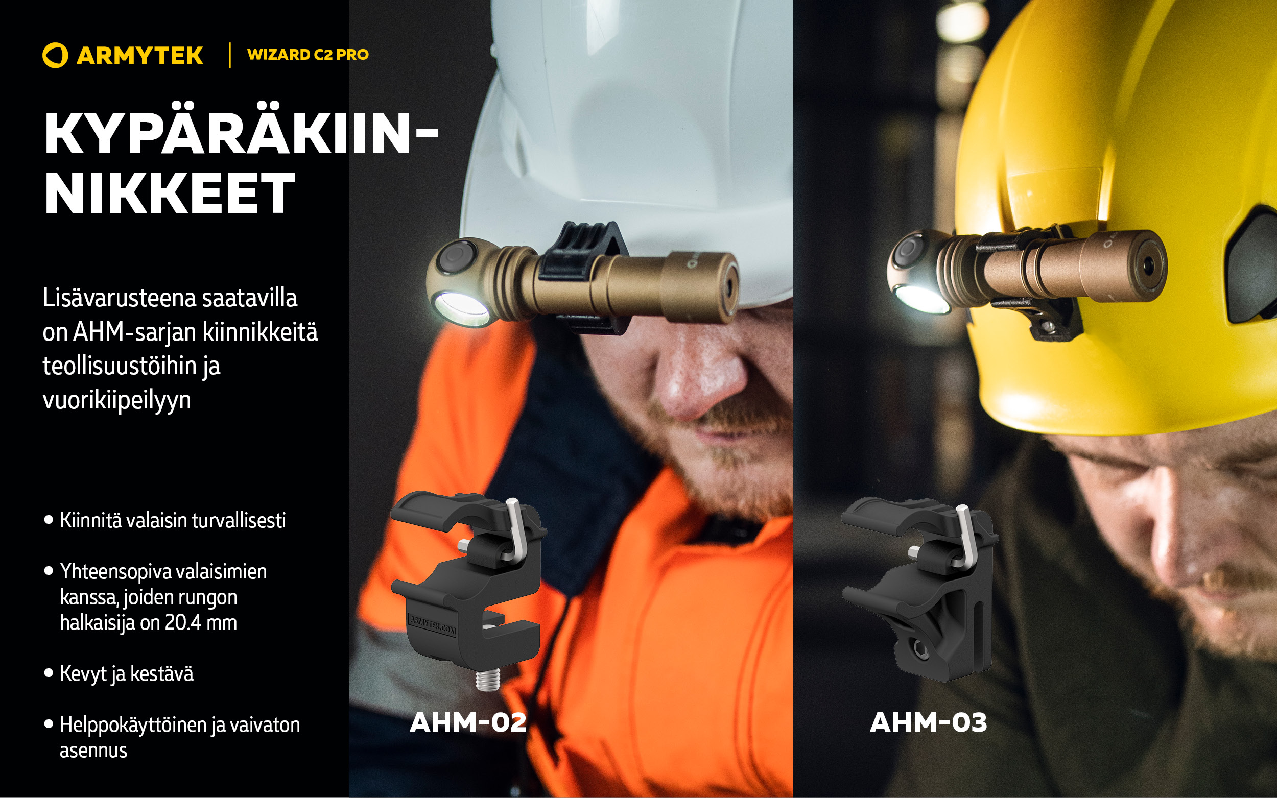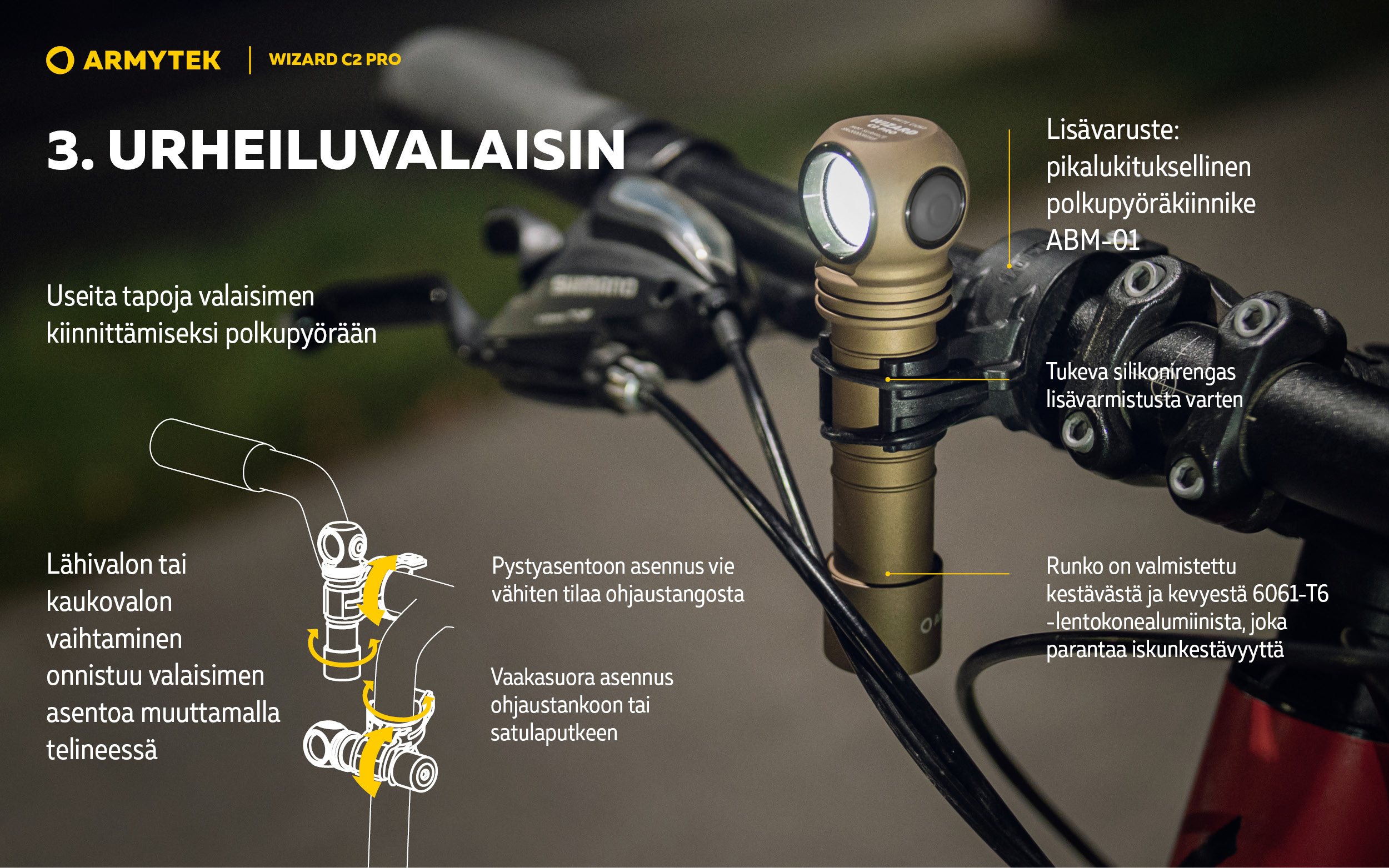 Tuotepakkaus sisältää mukavan otsakiinnikeen, klipsi vaatteisiin tai reppuun kiinnitystä varten sekä kestävän nailonkotelon. Wizard C2 Pro on yhteensopiva ABM-01 -polkupyöräkiinnikkeen ja AHM-sarjan kypäräkiinnikkeiden kanssa teollisuustöitä ja vuorikiipeilyä varten.