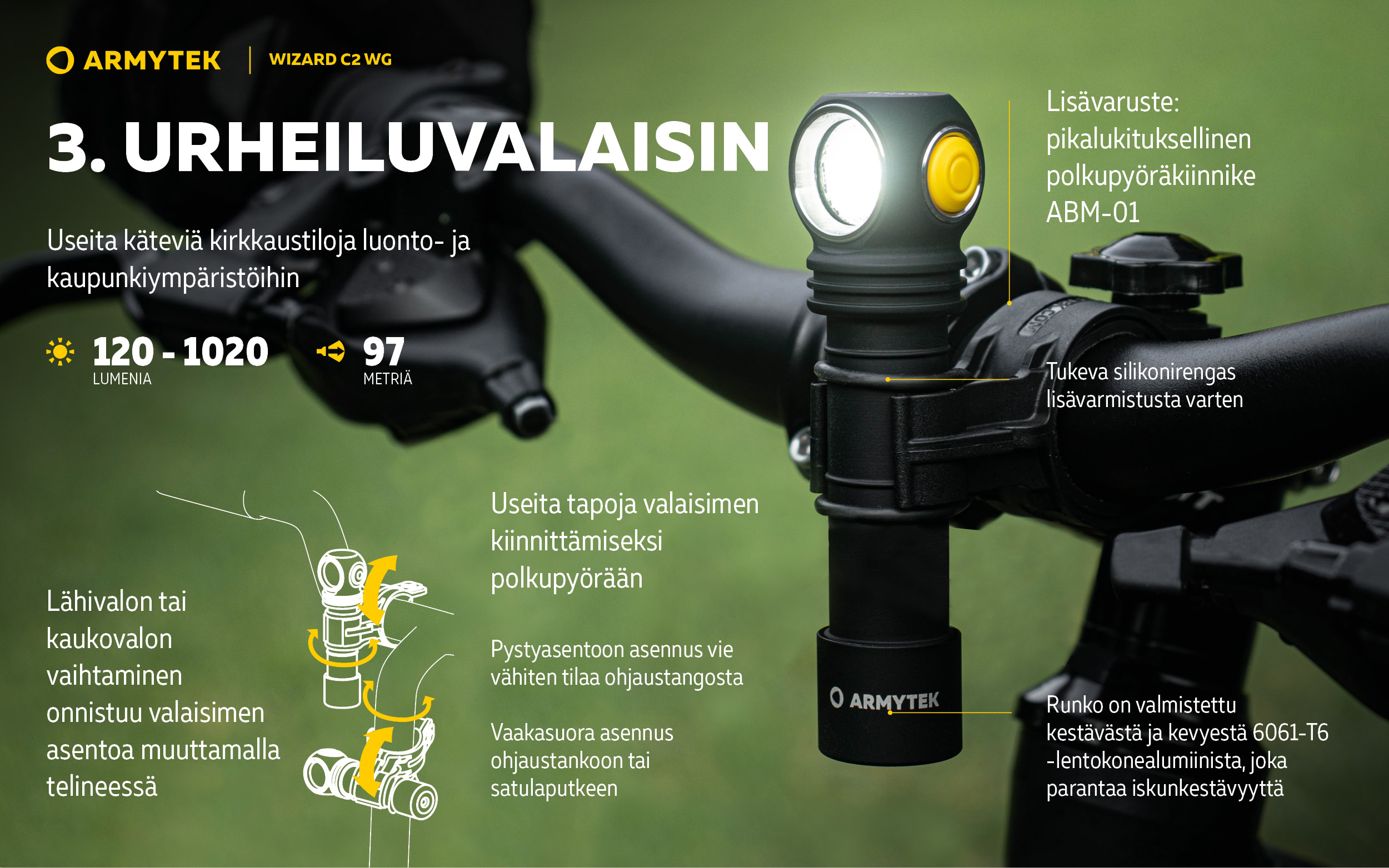 Valaisimessa on useita kiinnitysvaihtoehtoja. Tehokas magneetti takakorkissa mahdollistaa valaisimen kiinnittämisen mihin tahansa metallipintaan. Mukava otsapanta sekä teräsklipsi vaatteisiin tai reppuun kiinnitystä varten sisältyvät myyntipakkaukseen. Wizard C2 WG on yhteensopiva myös valinnaisen ABM-01 -polkupyöräkiinnikeen sekä AHM-sarjan kypäräkiinnikkeiden kanssa.