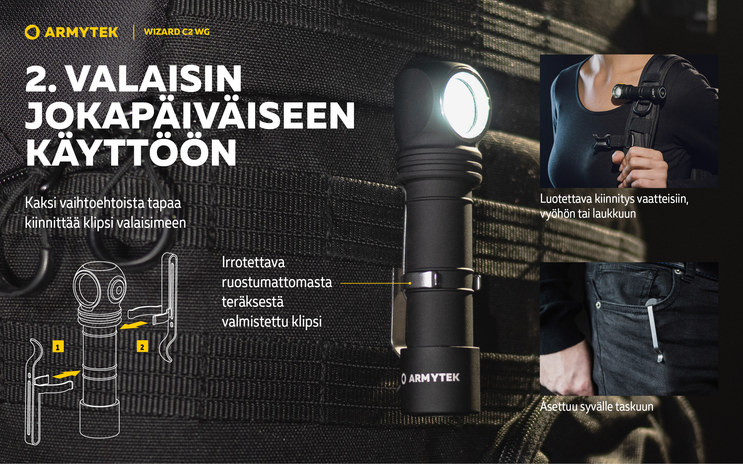 Valaisimessa on useita kiinnitysvaihtoehtoja. Tehokas magneetti takakorkissa mahdollistaa valaisimen kiinnittämisen mihin tahansa metallipintaan. Mukava otsapanta sekä teräsklipsi vaatteisiin tai reppuun kiinnitystä varten sisältyvät myyntipakkaukseen. Wizard C2 WG on yhteensopiva myös valinnaisen ABM-01 -polkupyöräkiinnikeen sekä AHM-sarjan kypäräkiinnikkeiden kanssa.