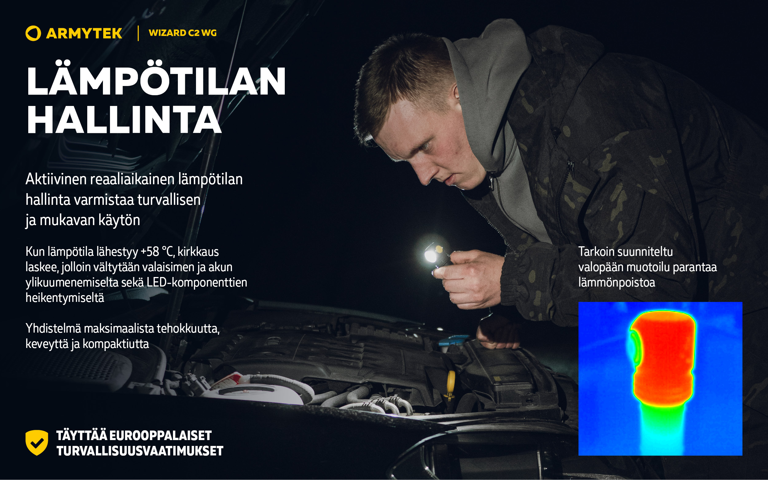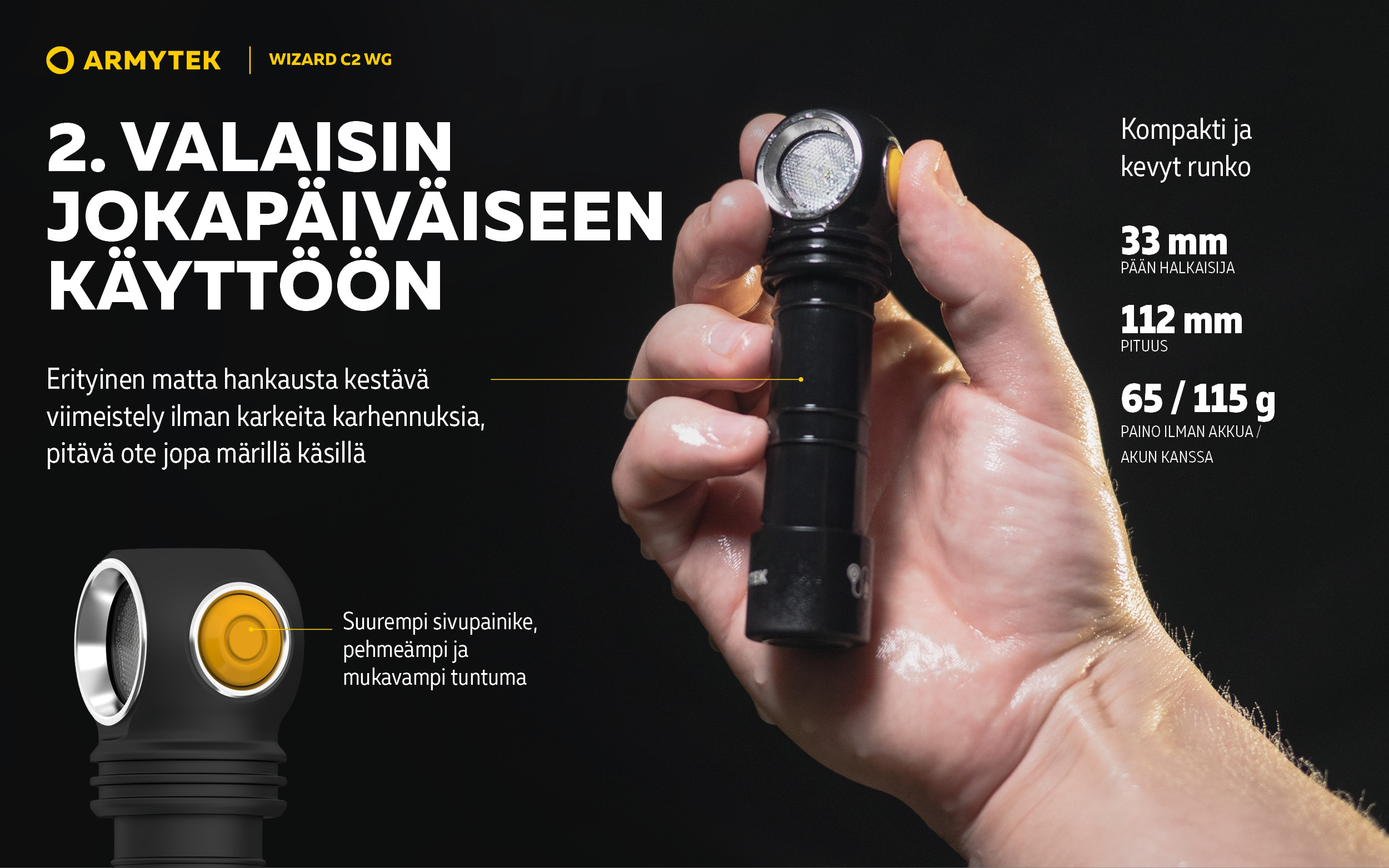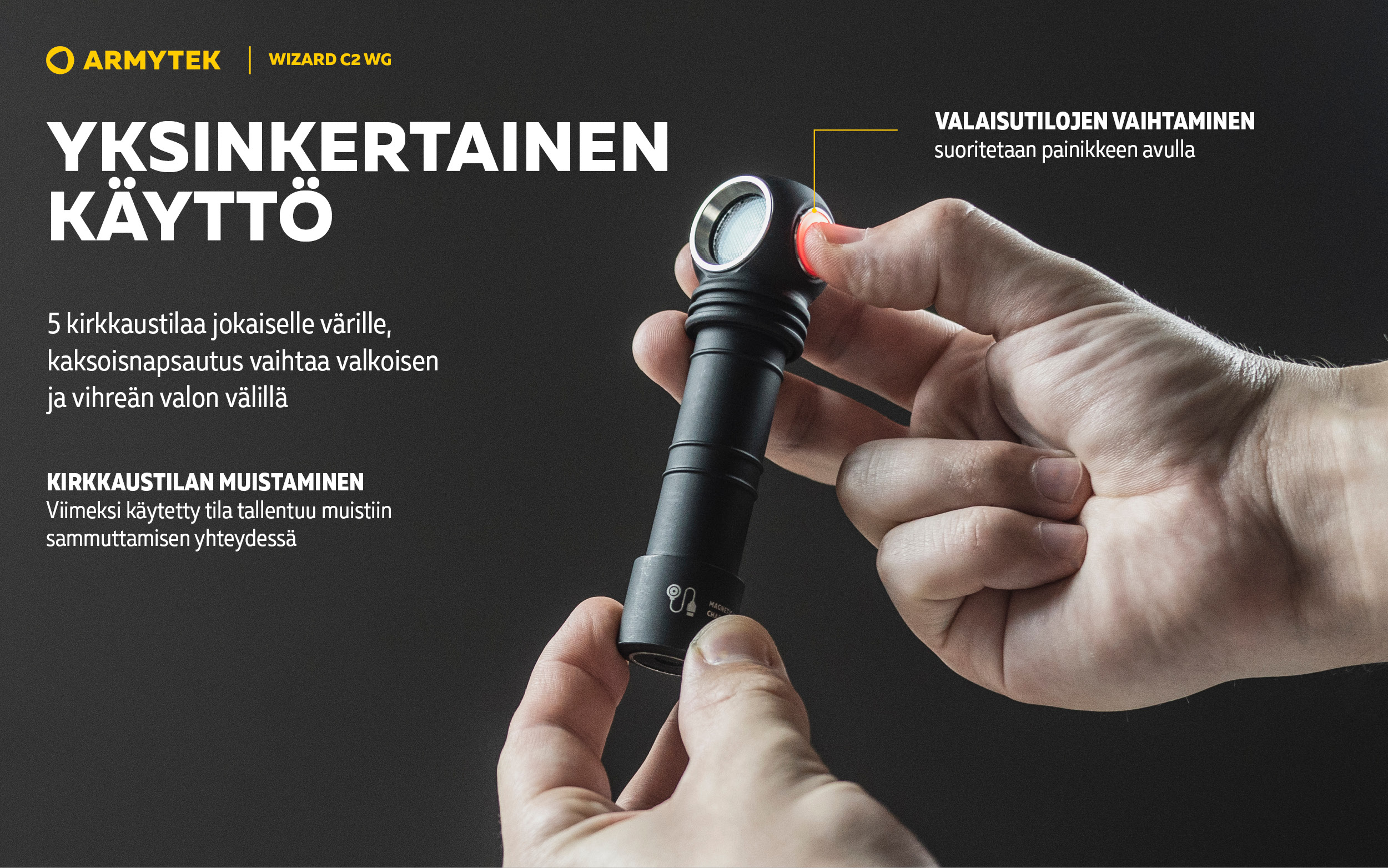 Neljä LEDiä, kaksi valovärivaihtoehtoa, yksi valaisin. Wizard C2 WG on monikäyttöinen pää- tai lisävalonlähde kaikenlaiseen toimintaan.