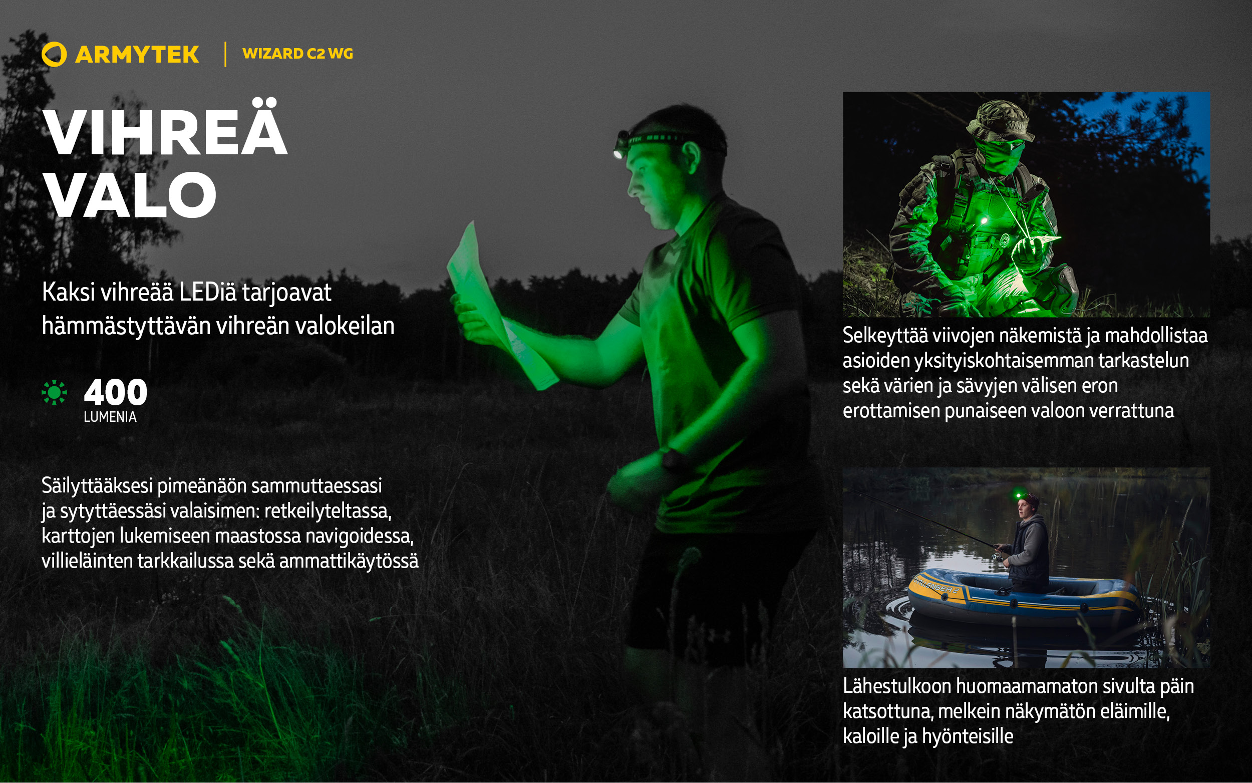 Aivan kuten punainen valo, vihreä valo on tehokas sumussa ja muissa rajoitetun näkyvyyden olosuhteissa ja on mukava pitkäaikaisessa käytössä. Vihreällä valolla on kuitenkin tärkeä etu: se mahdollistaa selkeämmän viivojen ja kohteiden yksityiskohtien erottamisen, jonka lisäksi se mahdollistaa värien erottamisen. Se on melkein näkymätön sivulta päin katsottuna, eivätkä eläimet ja linnut myöskään näe sitä uhkana, mikä on erityisen hyödyllistä villieläimiä havainnoitaessa tai metsästäessä. Wizard C2 WG:n käyttö vihreässä valotilassa ei houkuttele ärsyttäviä hyönteisiä.