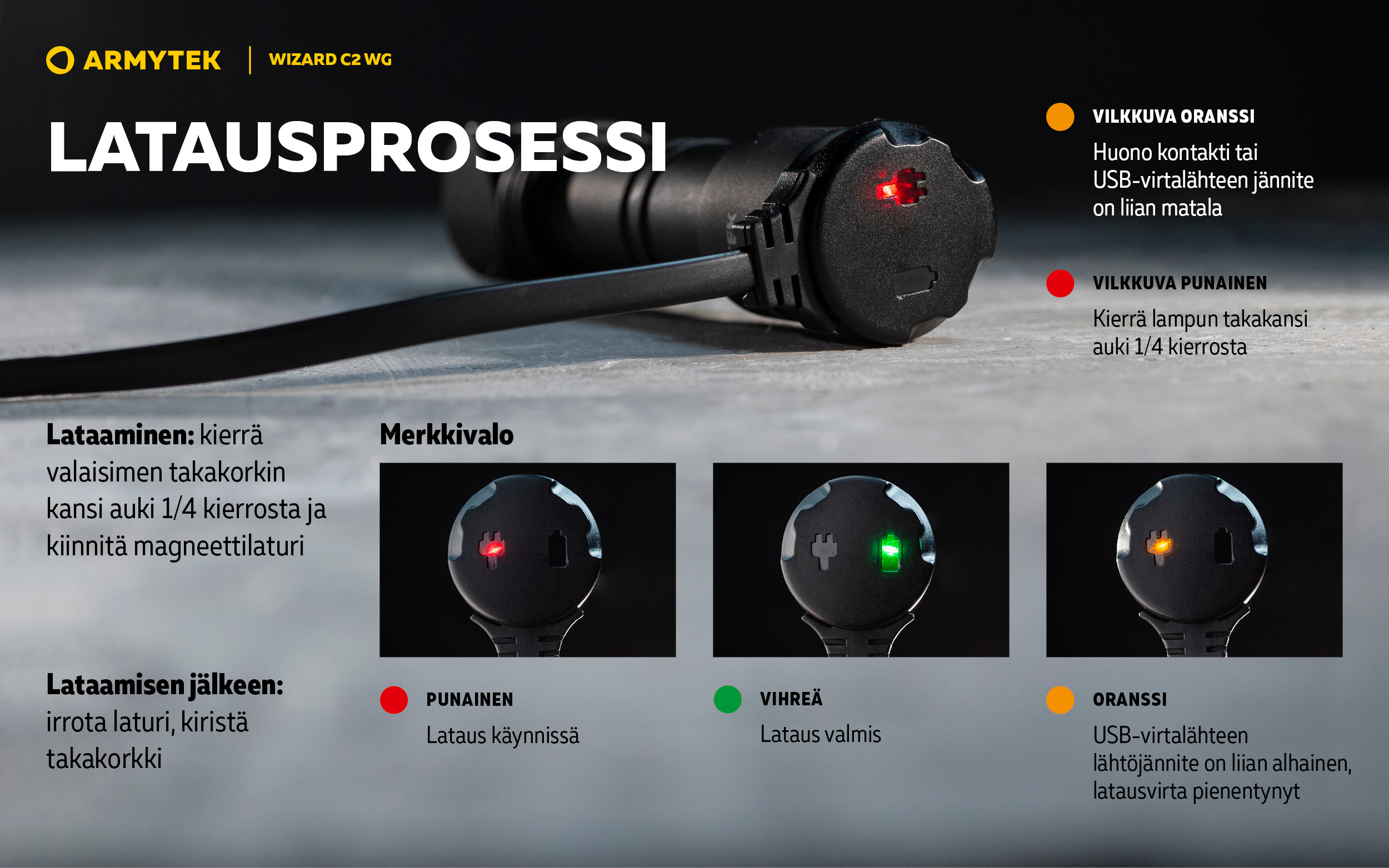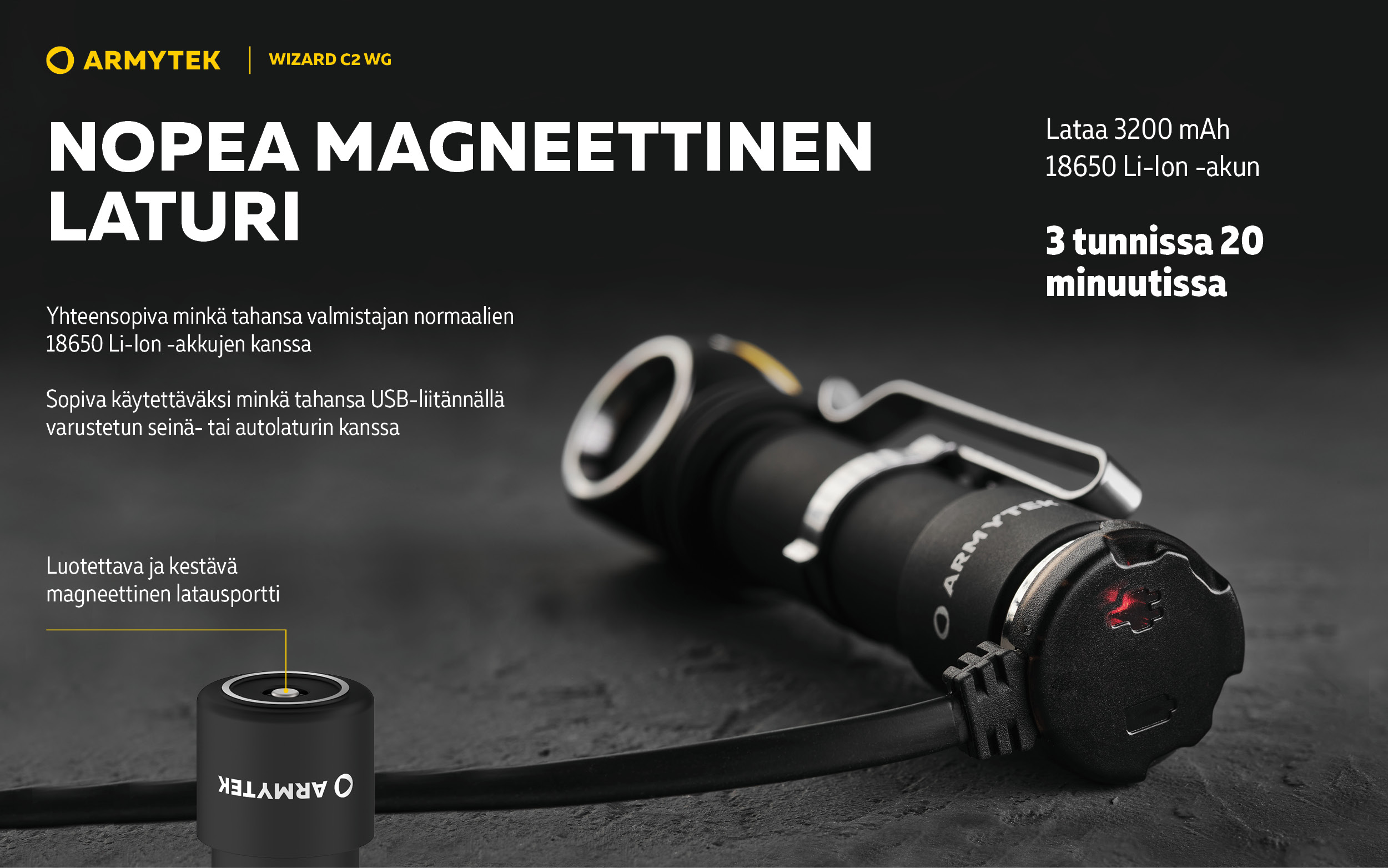 Magneettinen pikalaturi: mukana 18650 Li-Ion 3200 mAh -akku latautuu 3 tunnissa ja 20 minuutissa.