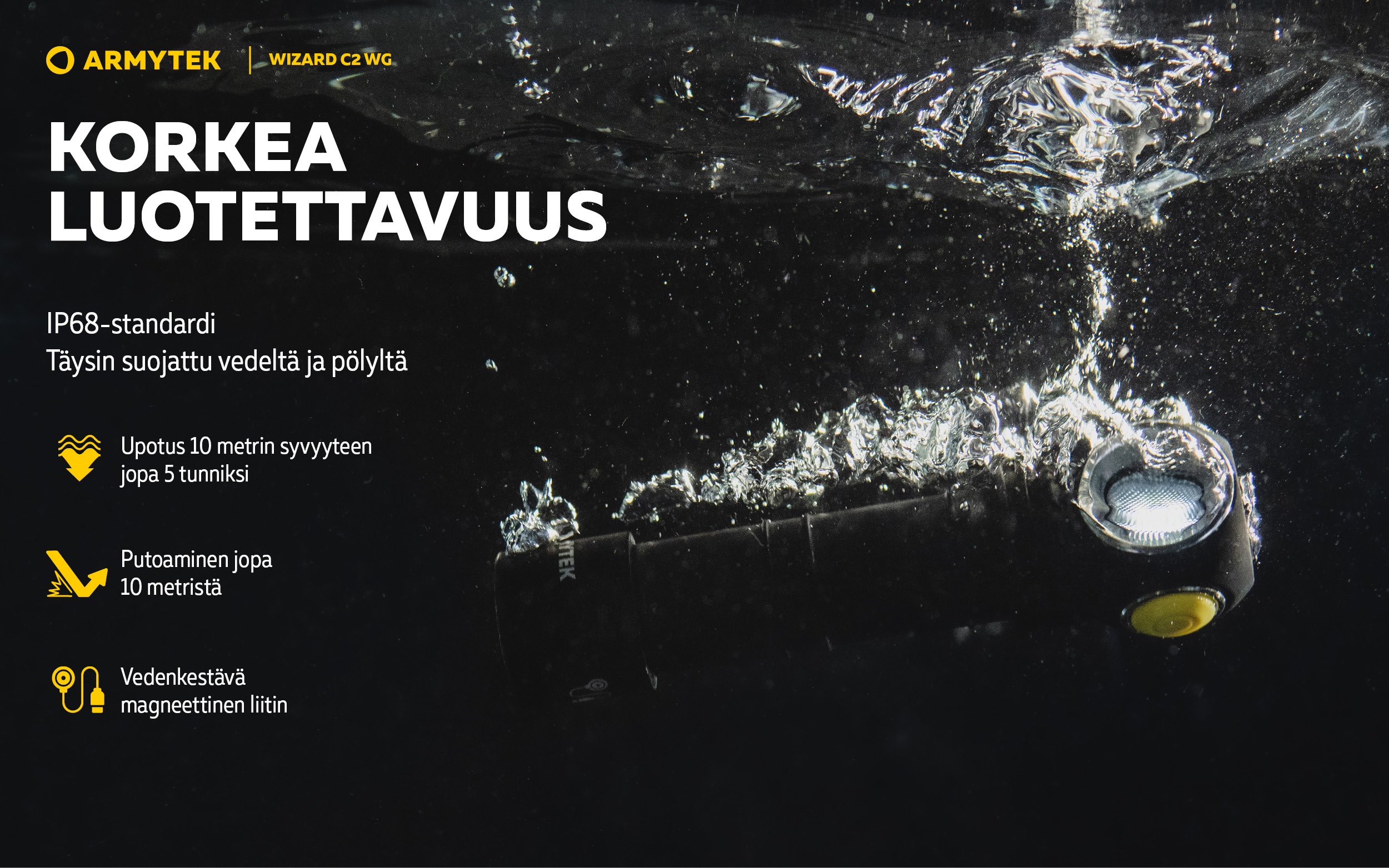 - Täysin suojattu vedeltä, lialta ja pölyltä IP68-standardin mukaisesti — valaisin jatkaa toimintaansa jopa 10 metrin syvyyteen upottamisen jälkeen. Kestää putoamiset jopa 10 metrin korkeudesta.