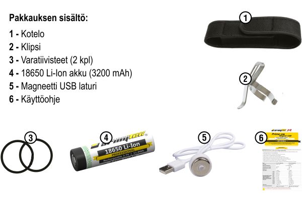 18650 Li-Ion akku ja USB-laturi mukana pakkauksessa.
